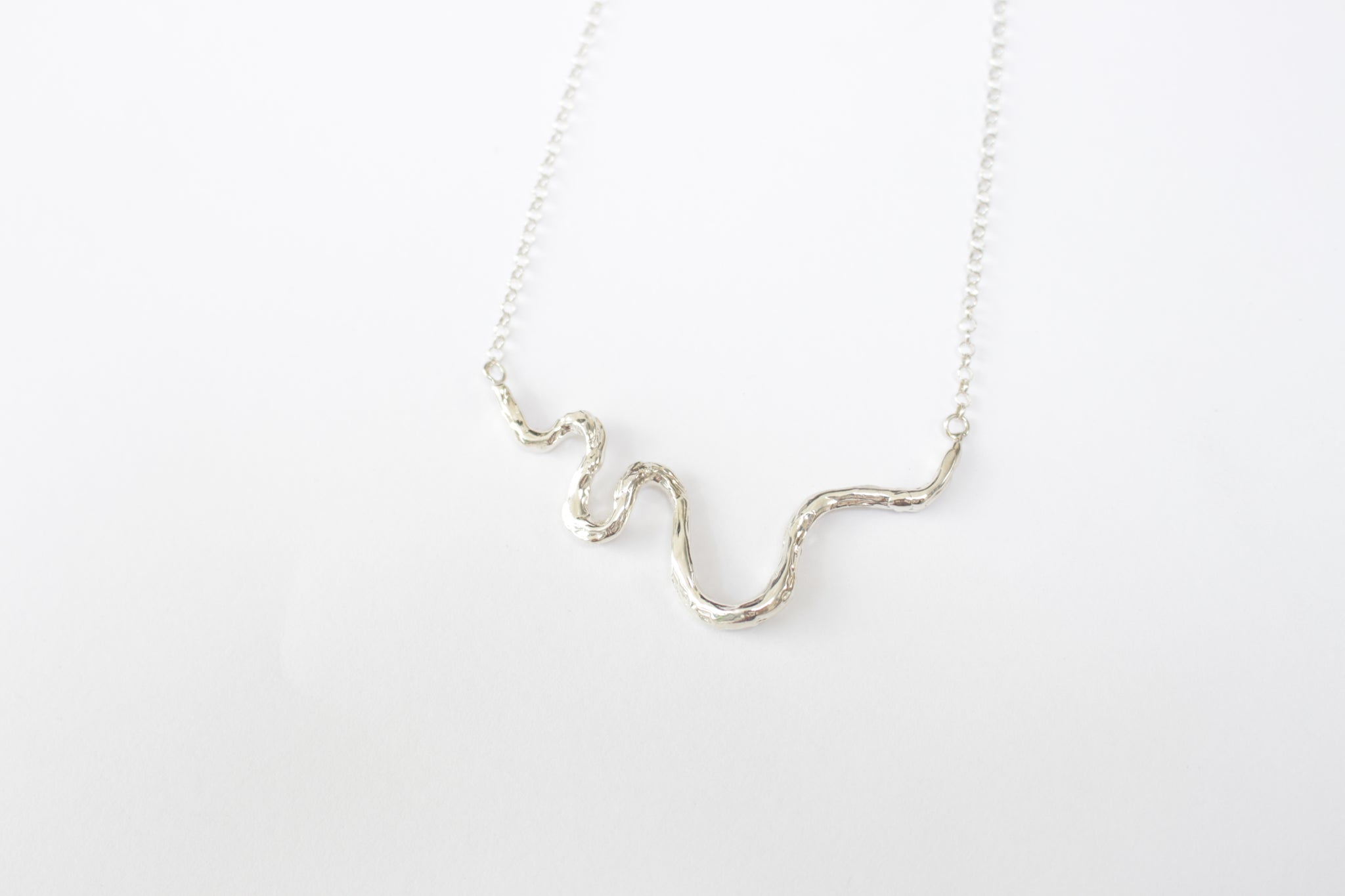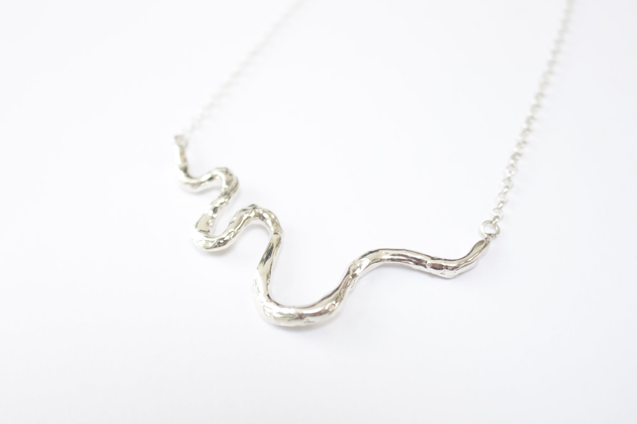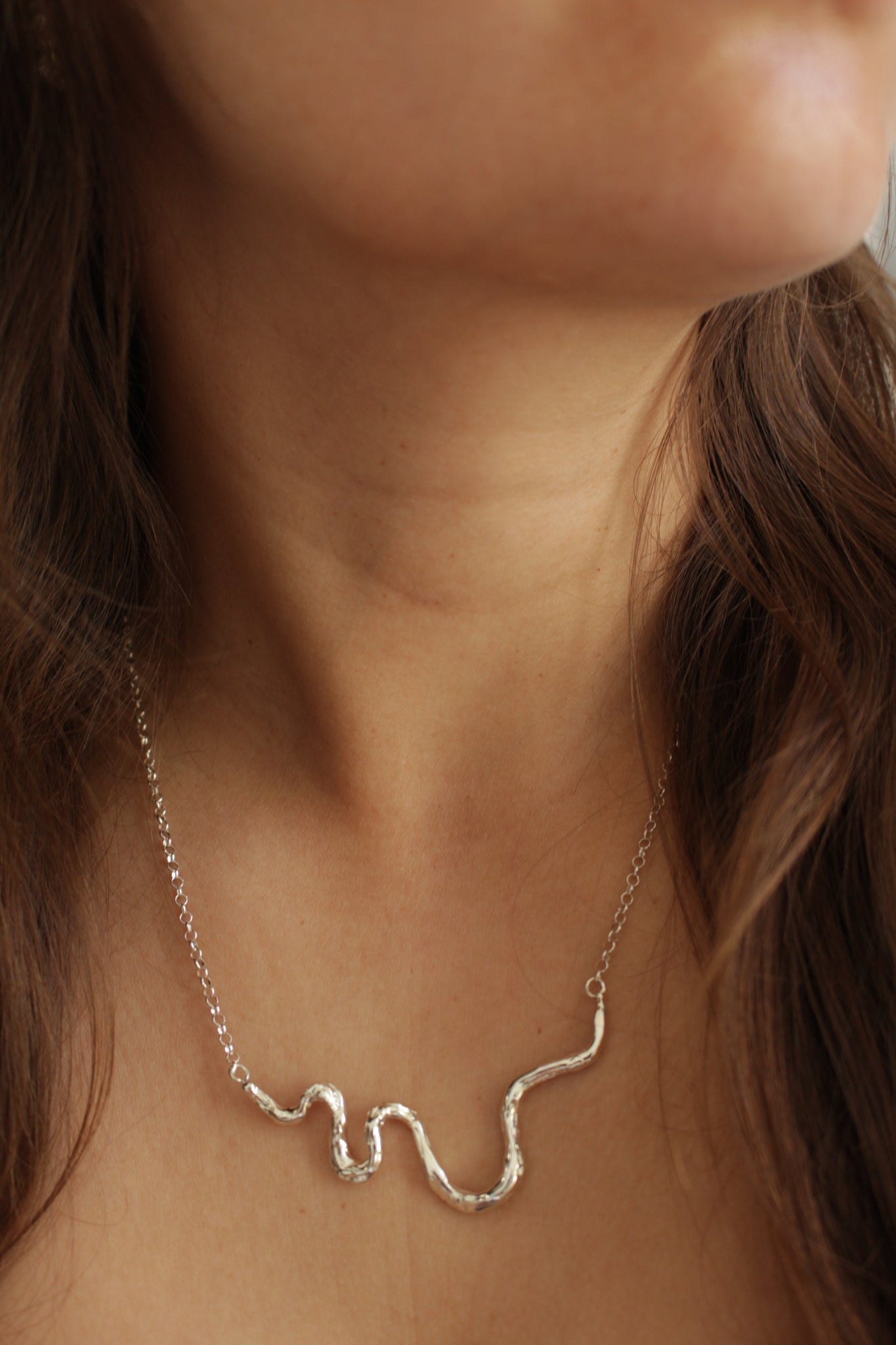 el collar onda tiene un tmaño grande y puede ajustarse la medida atorando el broch en las argollas. Mide originalmente 45cm de largo